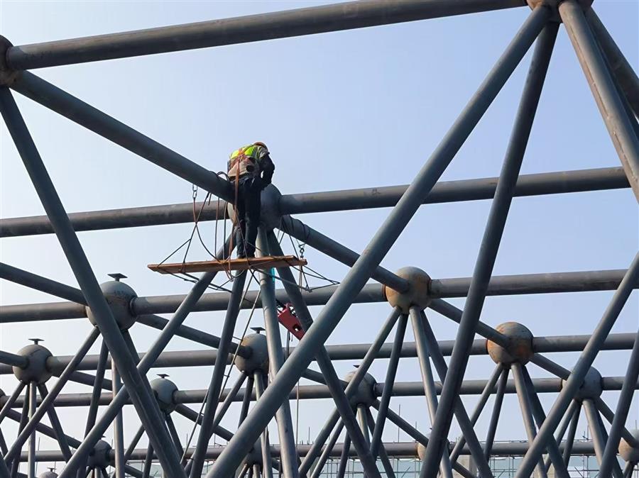 項目正在進(jìn)行鋼網(wǎng)架電焊、焊口除銹、焊口探傷檢測、鋼球補(bǔ)漆等鋼結(jié)構(gòu)施工。為確保項目順利推進(jìn),項目部倒排工期計劃并及時根據(jù)現(xiàn)場情況更新安排,配足人力機(jī)械,加班加點,齊心協(xié)力,全員投入推進(jìn)項目建設(shè)。目前,已完成拼裝任務(wù)的50%。