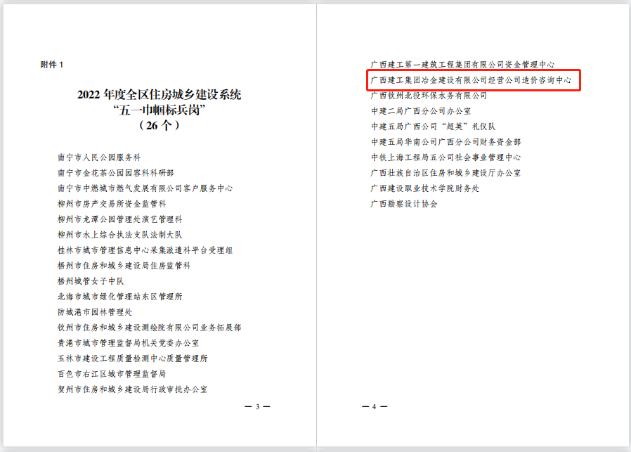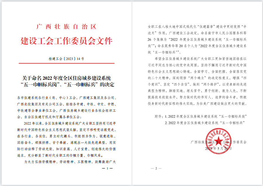 近日,廣西建設(shè)工會工作委員會下發(fā)了《關(guān)于命名2022年度全區(qū)住房城鄉(xiāng)建設(shè)系統(tǒng)“五一巾幗標(biāo)兵崗”“五一巾幗標(biāo)兵”的決定》,冶建經(jīng)營公司造價咨詢中心榮獲“五一巾幗標(biāo)兵崗”稱號。